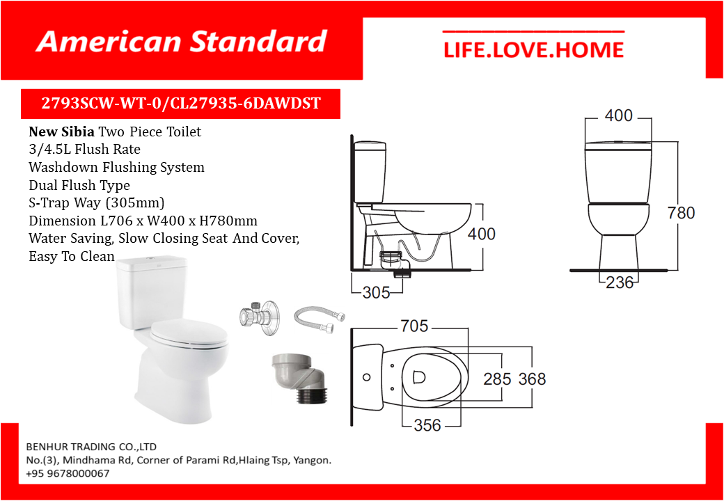 S&C ထိုင်ခုံပါရှိသော American Standard New Sibia Two Piece Toilet (2793SCW-WT-0)