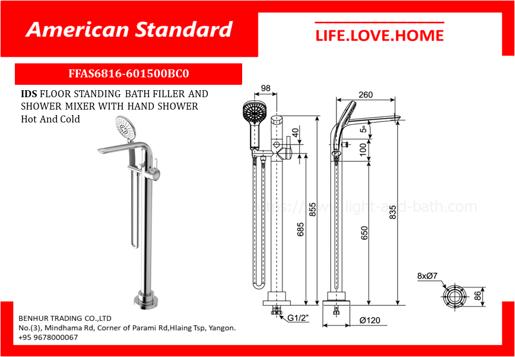 American Standard IDS Floor Standing Bath နှင့် Hand Shower အပူအအေးပါသော ရေချိုးခန်းသုံး ရေချိုးစက် (FFAS-6816-601500BC0)